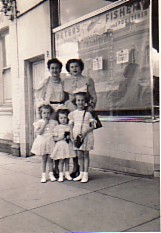 Above Right: Melbourne, 1955. With Marianthi Dalavera (right) and her three daughters. During the two-day stopover in the city, the Dalavera family looked after me. We are outside their family business.