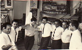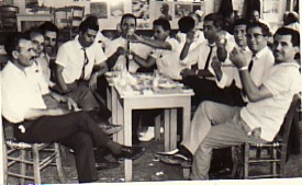 Above: At Allambra kafeneio with friends. L-R: unknown, Paraschos Drakoulas, Dimitrios Menemenios, Efstratios Panousos, Haralambos Katzos, Efstratios Alvanos, Socrates Kretzas, myself, Haralambos Giannakis, and Georgios Mihailaros.